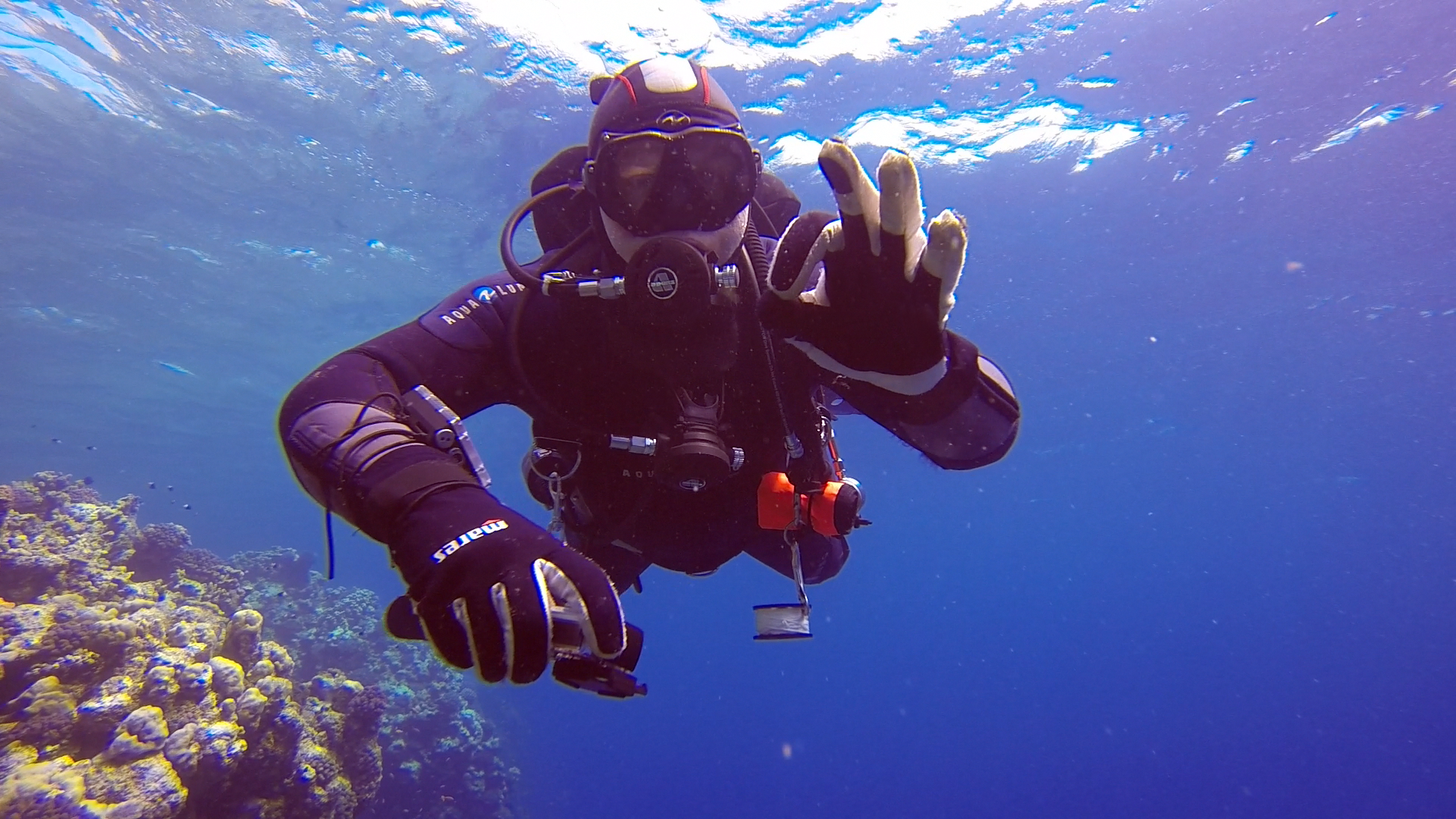 Mire a szalonnás langallókkal összekentük magunkat, mindenki rendelkezett egy merülésre kész, dupla winggel, amit aztán rögtön ki is próbáltunk. Ehhez kaptam egy Divelabs száraz ruhát, amit aláöltözőjével együtt magamra is öltöttem. Ez már az Aquaworld területén zajlik, ahol a négy méteres medencébe csobbanunk. Fundamental feladatok, az ember szokja és tanulja a mozdulatokat. Testhelyzet, lebegés kontroll, láb és uszonymozdulatok pár órában.
